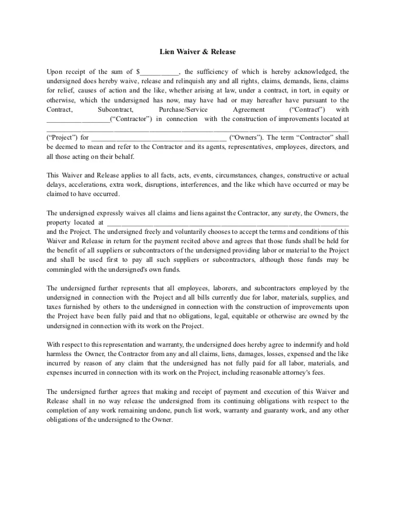 La renuncia al derecho de retención libera de la reclamación de un bien tras el pago de una cuota por servicios de construcción. Algunas partes importantes que deben incluirse para que la renuncia al derecho de retención sea legalmente vinculante son: