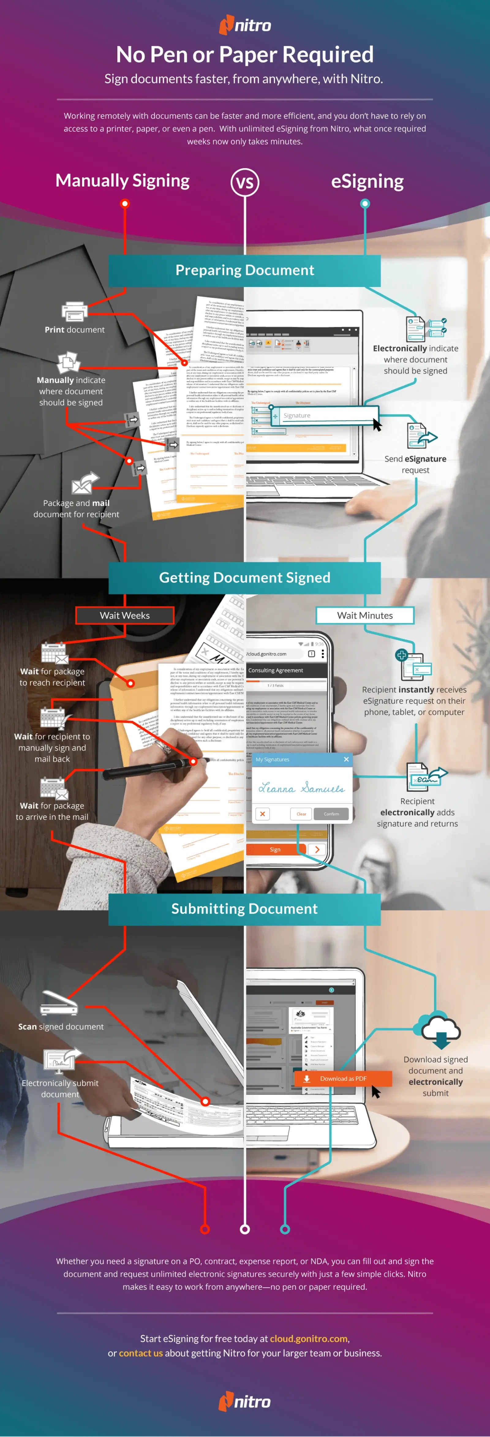 Nitro è stato lì per quei momenti che portano a lavorare lontano dall'ufficio, e con l'eSigning illimitato ciò che una volta richiedeva settimane con la carta tradizionale ora richiede solo pochi minuti. Non tornerai mai più a firmare manualmente con una penna.